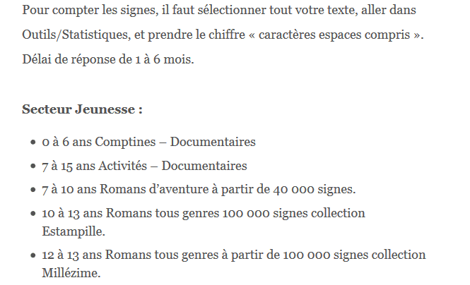 Les éditeurs jeunesse affichent souvent leurs attentes sur leur site. Par exemple, voici ce que l’on trouve sur la page de soumission des éditions Bayard :